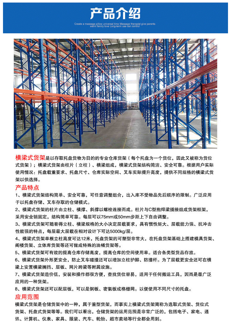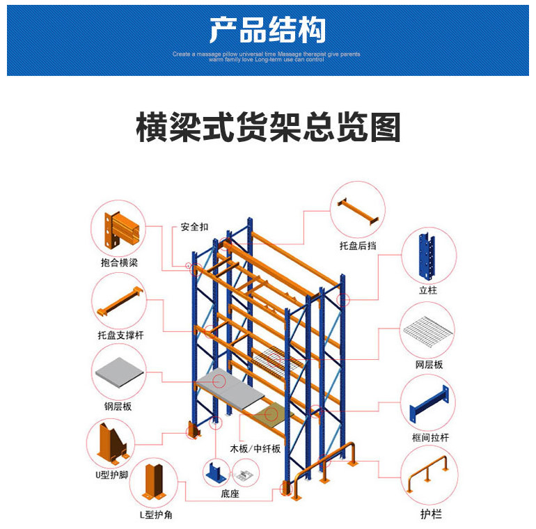 重型貨架,又俗稱橫梁式貨架,或稱貨位式貨架,屬于托盤貨架類,在國內(nèi)的各種倉儲貨架系統(tǒng)中較為常見一種貨架形式。以立柱片+橫梁形式的全組裝結(jié)構(gòu),結(jié)構(gòu)簡明有效。可根據(jù)存儲單元集裝設(shè)備的特性加裝如:隔檔、鋼層板(木層板)、金屬絲網(wǎng)層、倉儲籠導(dǎo)軌、油桶架等功能性附件。滿足不同單元集裝設(shè)備形式的貨物存儲。